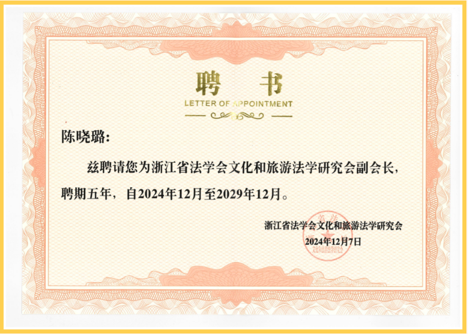 会议伊始,浙大城市学院法学院党委书记董尚胜,浙江省文化广电和旅游厅二级巡视员程钢致辞。经既定程序,会议选举产生了浙江省法学会文化和旅游法学研究会第三届理事会,浙大城市学院城市大脑研究院常务副院长、教授方洁当选为会长,吴红列、易凌、陈真亮、傅林放、黄恢月、张焯军、陈晓璐当选为副会长,胡斌当选为秘书长。其中,我所执行主任陈晓璐律师当选副会长。