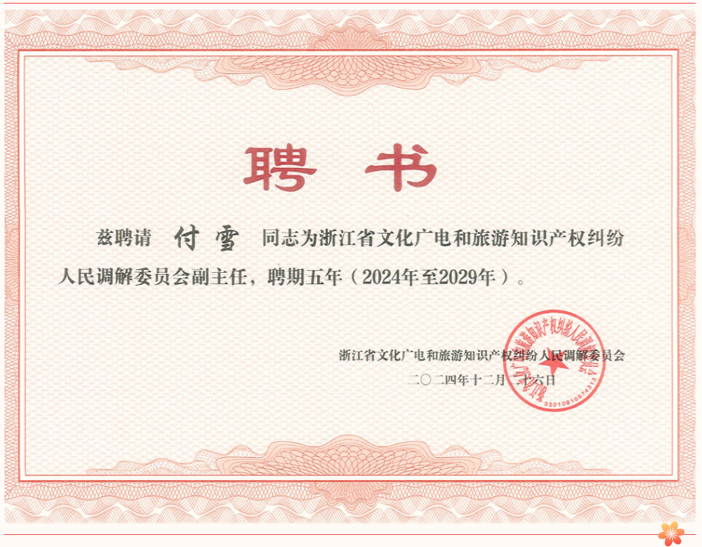 我所付雪律师作为浙江省文化艺术作品权益保护协会成员,于2024年10月23日受聘担任浙江省文化广电和旅游知识产权纠纷人民调解委员会副主任,此次会议为付雪律师等各成员正式发放公益服务站及调解委员会聘书。公益服务站成员将在有关部门的指导和支持下,为非遗传承和保护工作贡献力量。