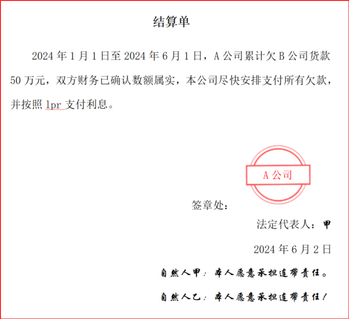 笔者近期代理一个案件:A公司与B公司涉合同纠纷,A公司未能按时支付货款,经双方结算,A公司出具《结算单》确认其欠付B公司货款50万元。第三人甲系A公司法定代表人,第三人乙与甲系朋友关系,甲、乙均在《结算单》上签字确认,承诺“本人愿意承担连带责任”。