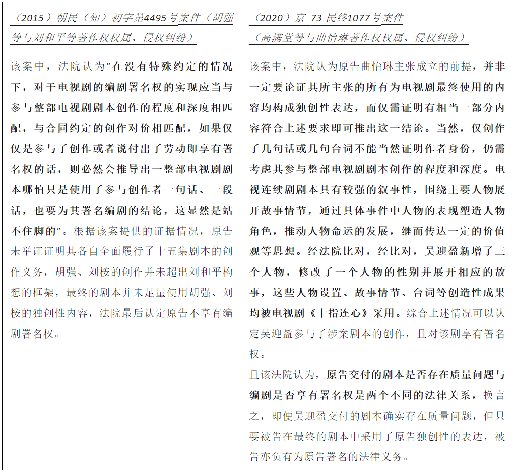 小结:在司法实践中,笔者认为编剧是否享有署名的关键标准关键在于编剧的独创性成果在最终剧本中的实际使用情况。至于编剧的署名方式,法院一是尊重双方的意思自治,以及尊重制片方在合理范围内的自由裁量的基础上结合编剧实际贡献度来认定。至于编剧的独创性成果对影视剧的贡献度,仍然是一个比较主观的判断,尤其在诉讼过程中举证难度大,需要大量的台词桥段等内容作“实质性相似”的比对来证明编剧的贡献与最终剧本的匹配度。