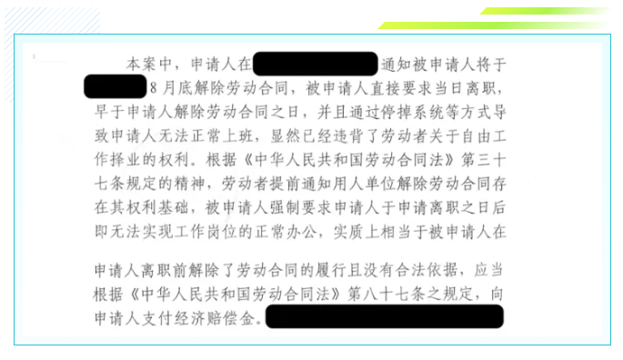 案例1:员工提出离职后公司要求其立即离职并停止其使用工作系统(违法解除判赔)